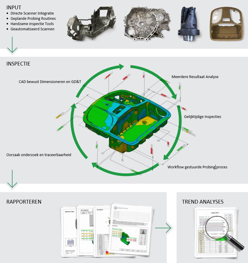 Geomagic Control X levert de nauwkeurigste, snelste, uitgebreide en geautomatiseerde rapporten over de kwaliteit van uw geproduceerde onderdelen. Onderdelen kunnen gemeten worden met verschillende meetmethoden, bijvoorbeeld met een CMM of een laser scanner. Met Geomagic Control X kunt u makkelijk CAD data importeren en bijvoorbeeld een vleugelinspectie doen om de productiekwaliteit te controleren.