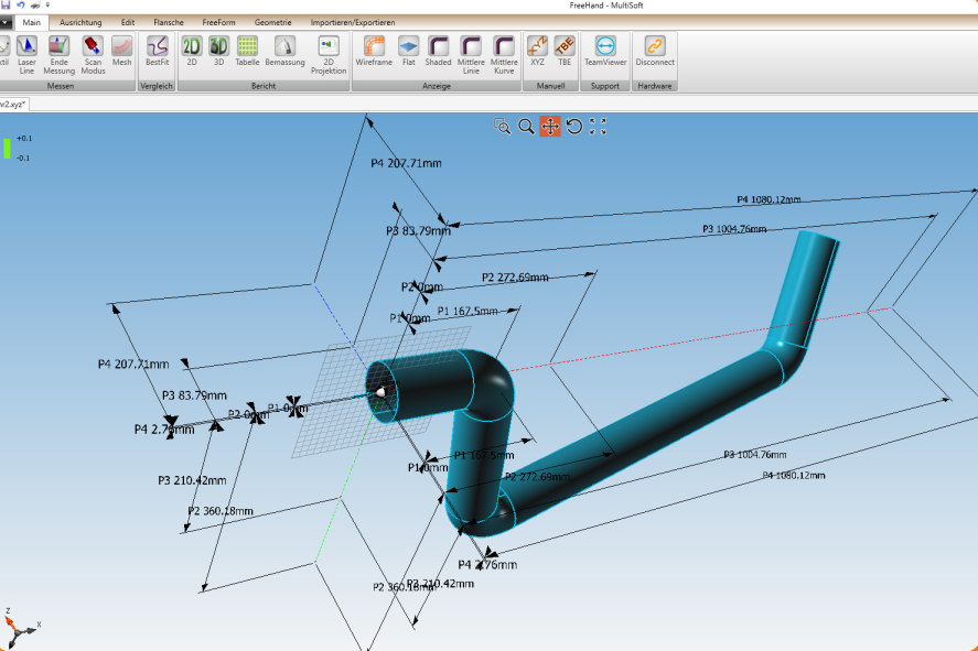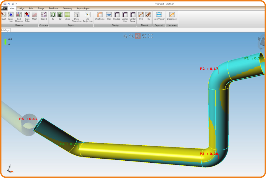Nadat u een buis heeft ingemeten in Multisoft, kunt u door middel van een nominaal model een vergelijking maken tussen de realiteit en het digitaal model (nominaal). Verschillende manieren van uitrichten zorgen ervoor dat u precies kunt zien waar uw gemeten buis afwijkt van de nominaal.
